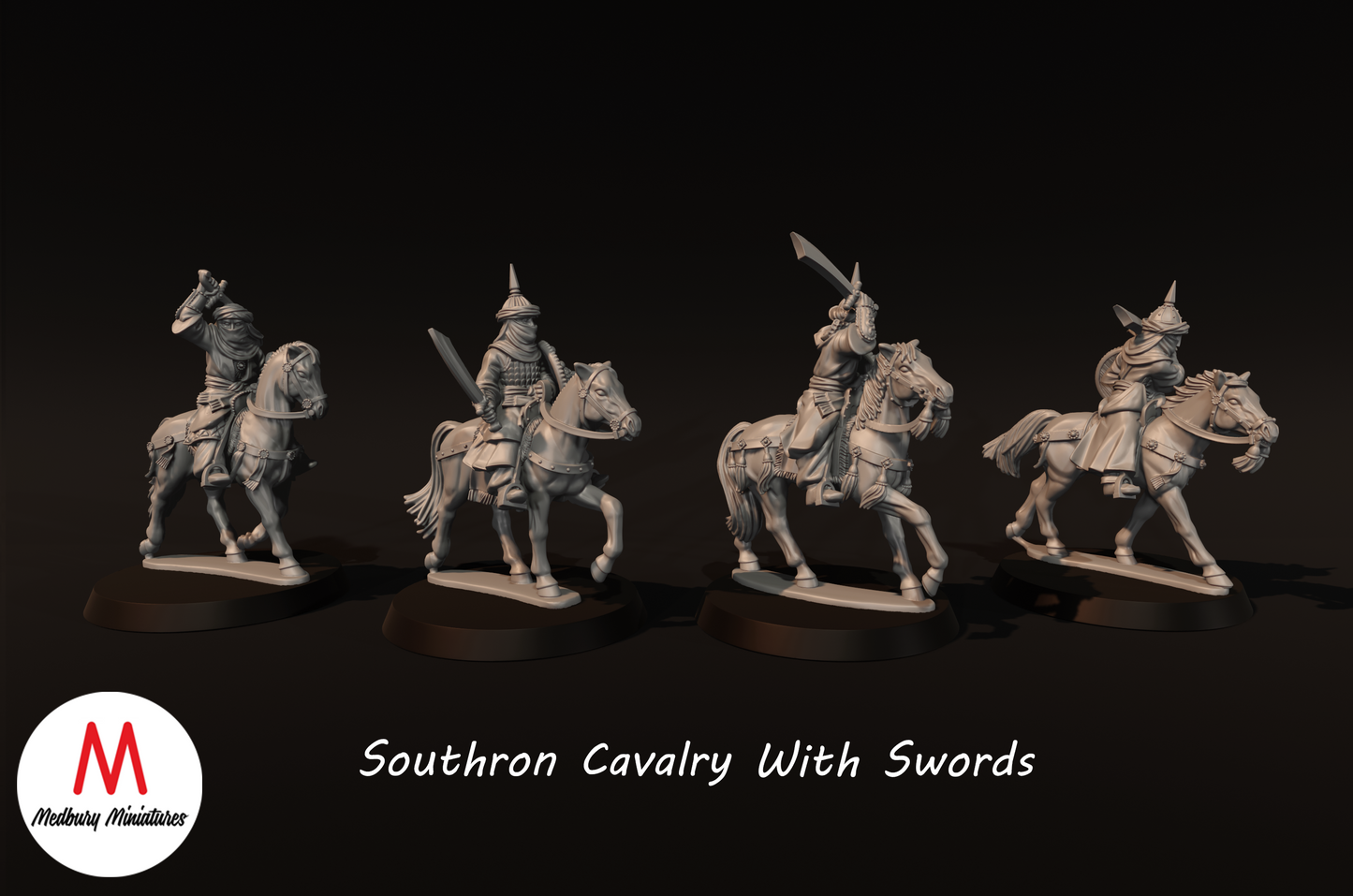 Four Southron Cavalry. This kit includes everything pictured in the first image. Printed in 28mm scale. Miniature design by Medbury Miniatures. Produced by HammerLine Miniatures. All Hammerline Miniatures products are 3D printed using high-quality resin and are washed, cured and have the majority of supports removed. Some clean up and assembly may be required. Models provided unpainted. Bases supplied.